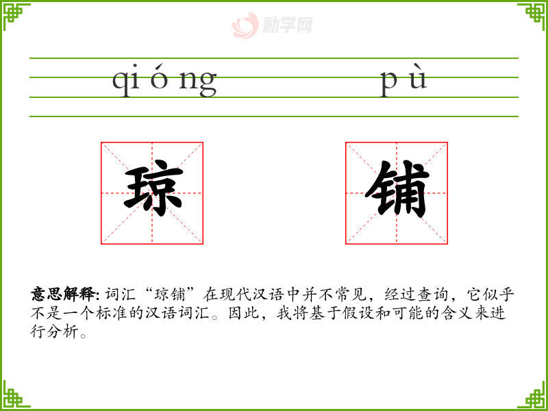 词汇“琼铺”在现代汉语中并不常见,经过查询,它似乎不是一个标准的汉语词汇。因此,我将基于假设和可能的含义来进行分析。