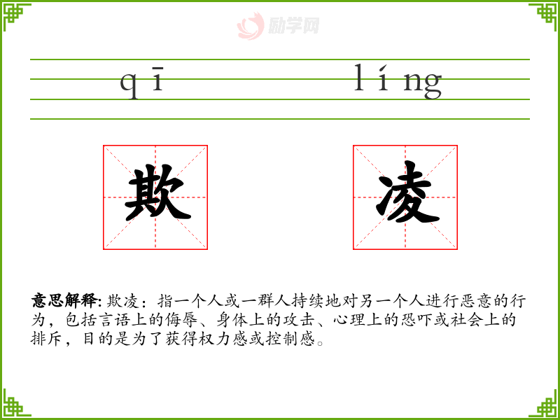 - 词源:欺凌一词源自中文,由“欺”和“凌”两个字组成,分别表示欺骗和超越。