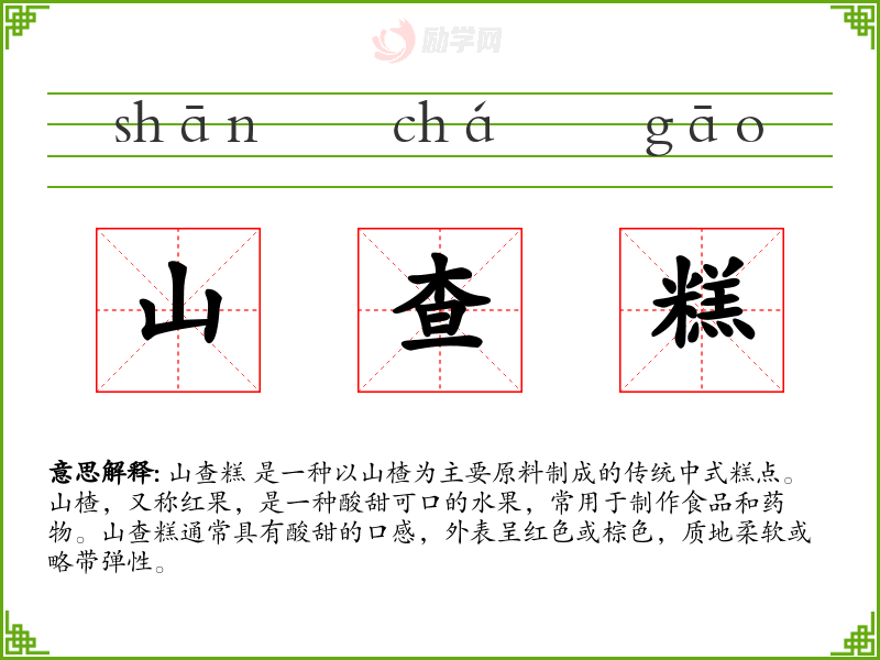 山查糕的意思是:用山楂果实为主要原料熬制成的糕,红色,味甜酸。