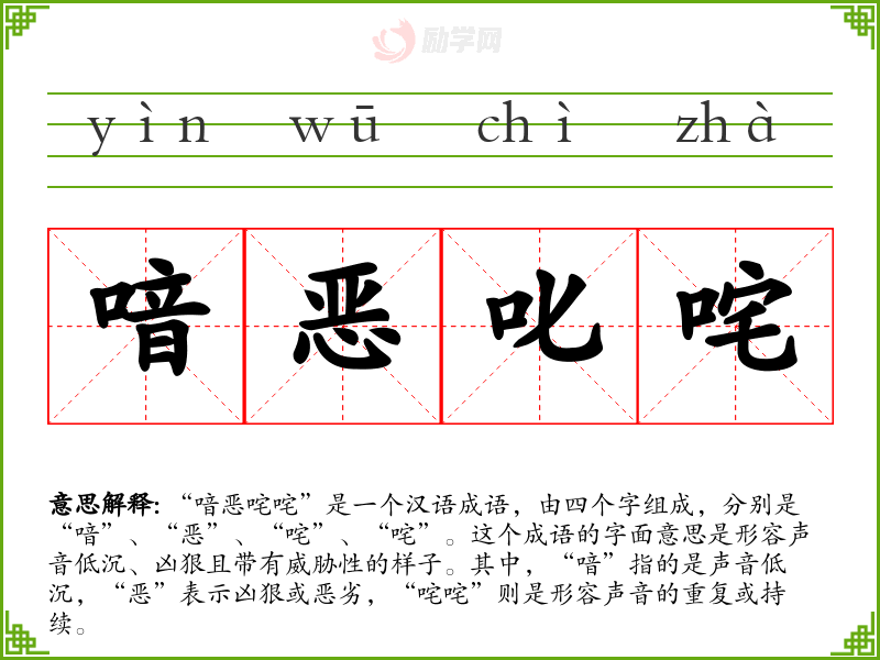 “喑恶咤咤”是一个汉语成语,由四个字组成,分别是“喑”、“恶”、“咤”、“咤”。这个成语的字面意思是形容声音低沉、凶狠且带有威胁性的样子。其中,“喑”指的是声音低沉,“恶”表示凶狠或恶劣,“咤咤”则是形容声音的重复或持续。