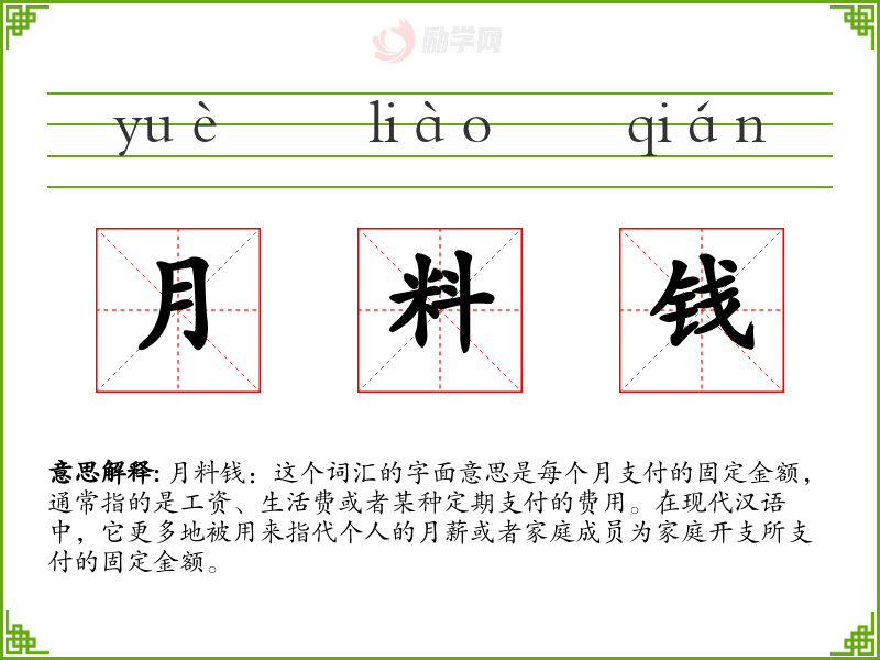月料钱:这个词汇的字面意思是每个月支付的固定金额,通常指的是工资、生活费或者某种定期支付的费用。在现代汉语中,它更多地被用来指代个人的月薪或者家庭成员为家庭开支所支付的固定金额。