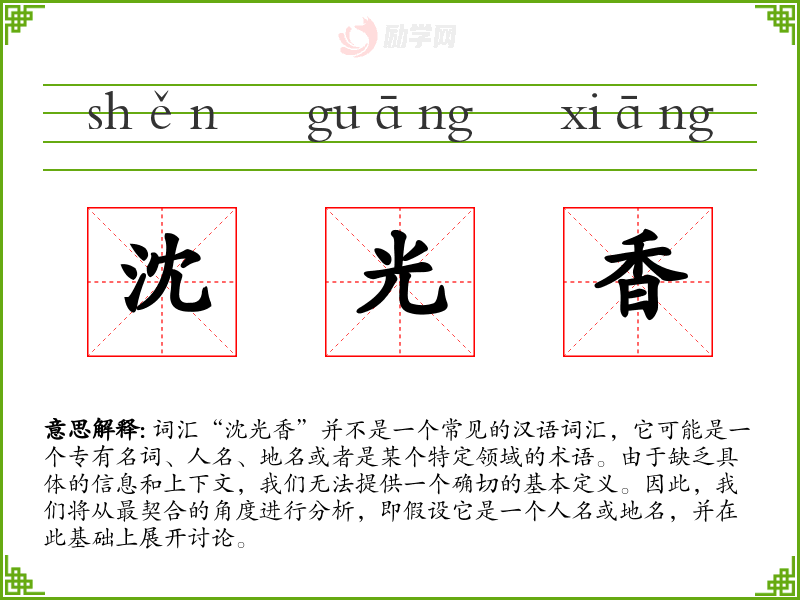 如果“沈光香”是一个人名,那么它可能是由三个汉字组成的名字,其中“沈”可能是姓氏,“光”和“香”可能是名字的一部分,分别代表光明、香气等含义。如果它是一个地名,那么它可能是某个地方的名称,具有特定的地理或历史背景。