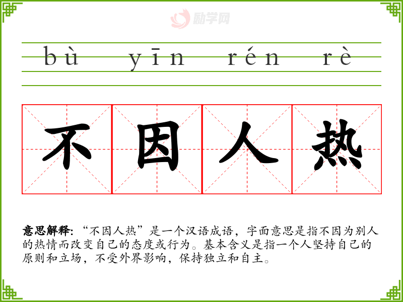 “不因人热”是一个汉语成语,字面意思是指不因为别人的热情而改变自己的态度或行为。基本含义是指一个人坚持自己的原则和立场,不受外界影响,保持独立和自主。