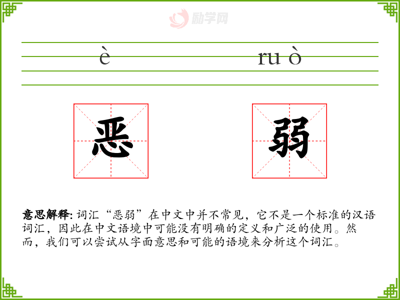 词汇“恶弱”在中文中并不常见,它不是一个标准的汉语词汇,因此在中文语境中可能没有明确的定义和广泛的使用。然而,我们可以尝试从字面意思和可能的语境来分析这个词汇。