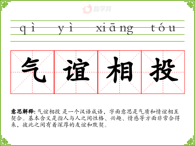 气谊相投 是一个汉语成语,字面意思是气质和情谊相互契合。基本含义是指人与人之间性格、兴趣、情感等方面非常合得来,彼此之间有着深厚的友谊和默契。