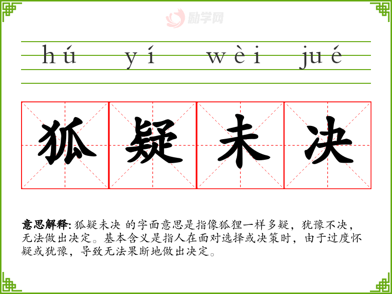狐疑未决 的字面意思是指像狐狸一样多疑,犹豫不决,无法做出决定。基本含义是指人在面对选择或决策时,由于过度怀疑或犹豫,导致无法果断地做出决定。