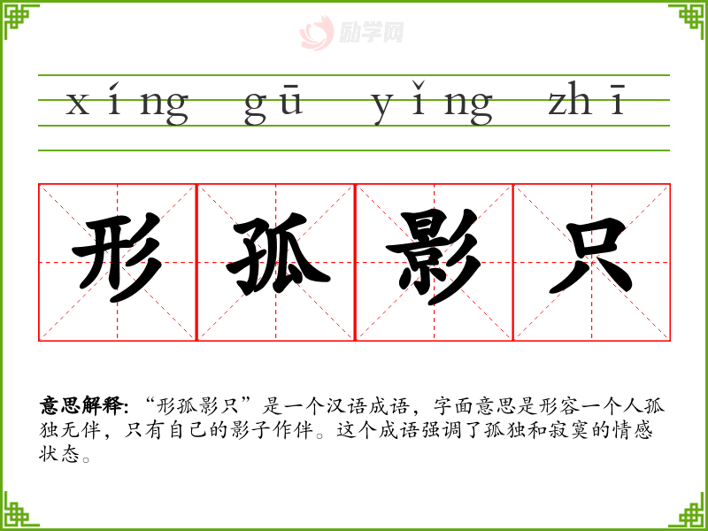 在文学作品中,“形孤影只”常用来描绘主人公的孤独心境,增强情感的深度。在口语中,这个成语可能不太常用,但可以用来形容某人非常孤独的状态。在专业领域,如心理学或社会学,这个词汇可能被用来描述个体在社会关系中的孤立状态。