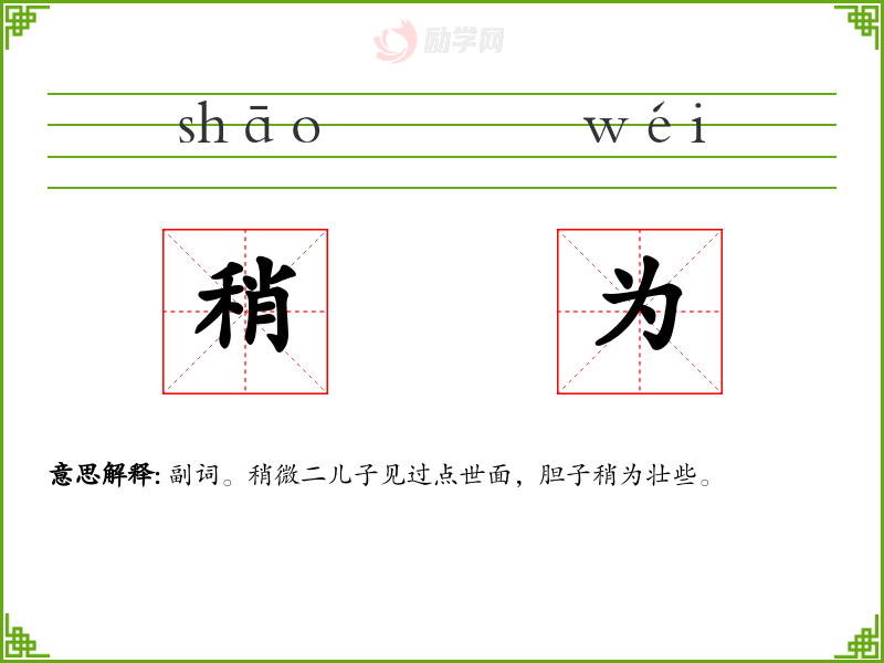 稍为的意思是:副词。稍微二儿子见过点世面,胆子稍为壮些。