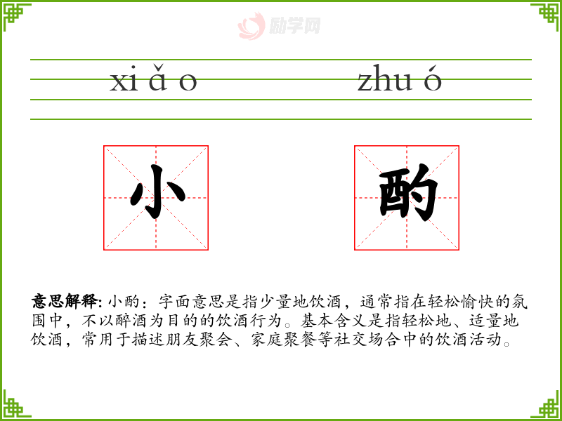 小酌:字面意思是指少量地饮酒,通常指在轻松愉快的氛围中,不以醉酒为目的的饮酒行为。基本含义是指轻松地、适量地饮酒,常用于描述朋友聚会、家庭聚餐等社交场合中的饮酒活动。