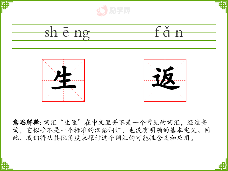 词汇“生返”在中文里并不是一个常见的词汇,经过查询,它似乎不是一个标准的汉语词汇,也没有明确的基本定义。因此,我们将从其他角度来探讨这个词汇的可能性含义和应用。