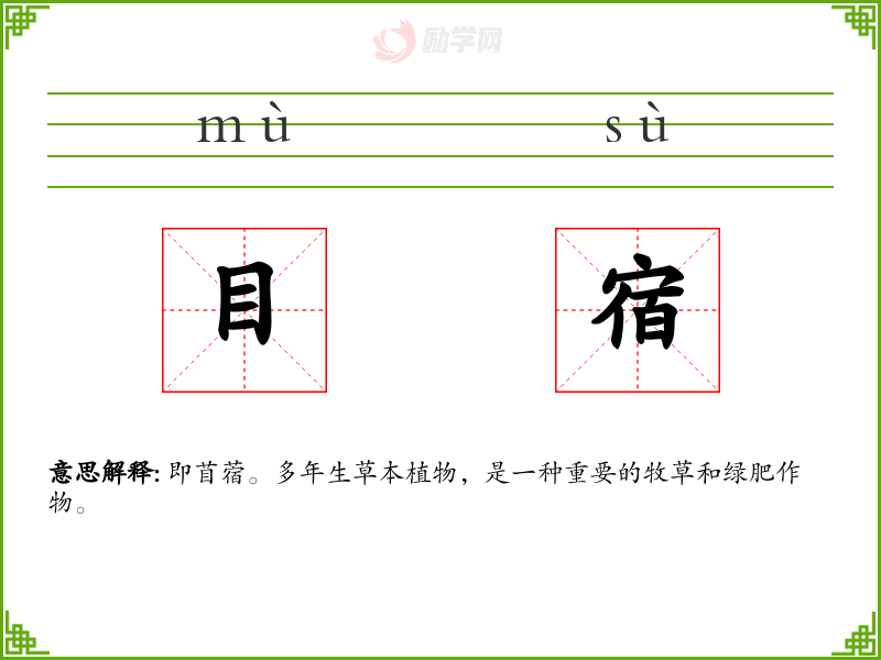 目宿的意思是:即苜蓿。多年生草本植物,是一种重要的牧草和绿肥作物。