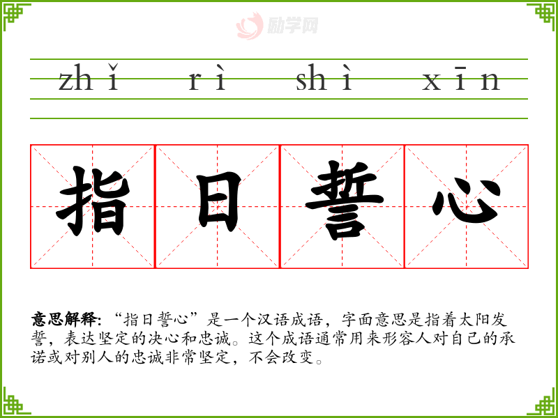 “指日誓心”是一个汉语成语,字面意思是指着太阳发誓,表达坚定的决心和忠诚。这个成语通常用来形容人对自己的承诺或对别人的忠诚非常坚定,不会改变。