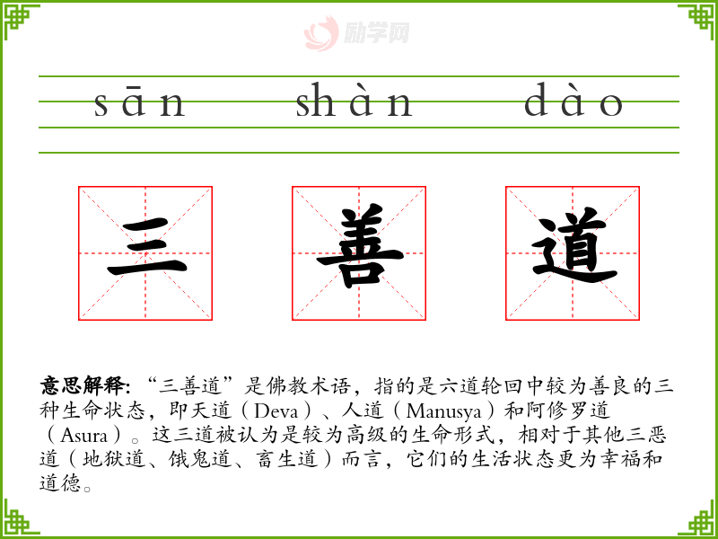 - 反义词:三恶道(地狱道、饿鬼道、畜生道)