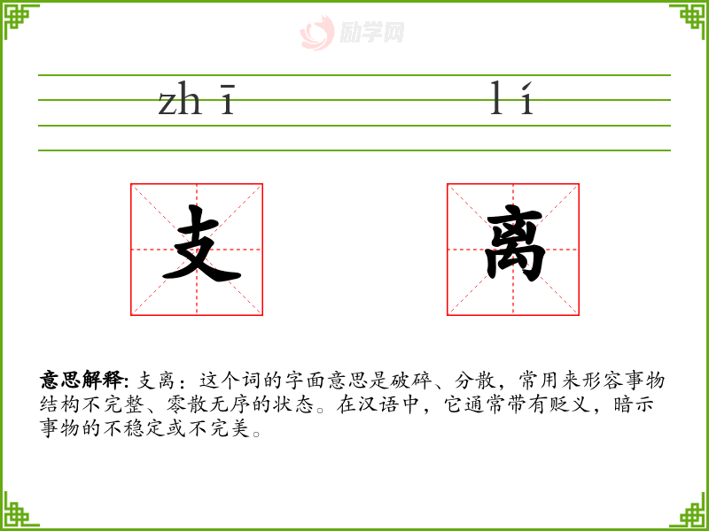 - 文学:在文学作品中,“支离”常用来形容场景、情节或人物心理的破碎感,如“支离破碎的记忆”。