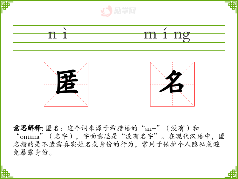 匿名:这个词来源于希腊语的“an-”(没有)和“onuma”(名字),字面意思是“没有名字”。在现代汉语中,匿名指的是不透露真实姓名或身份的行为,常用于保护个人隐私或避免暴露身份。