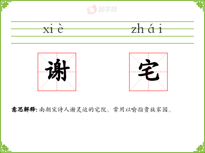 谢宅的意思是:南朝宋诗人谢灵运的宅院。常用以喻指贵族家园。