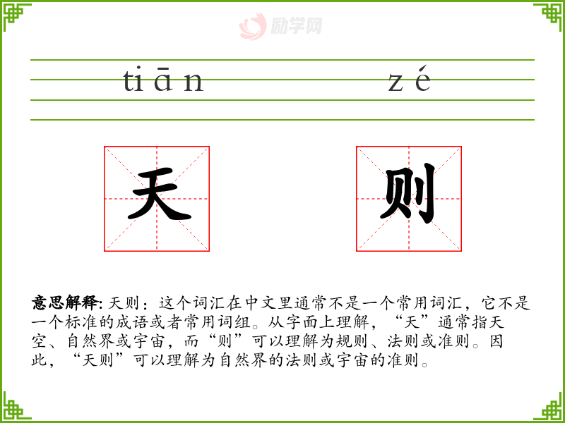 天则:这个词汇在中文里通常不是一个常用词汇,它不是一个标准的成语或者常用词组。从字面上理解,“天”通常指天空、自然界或宇宙,而“则”可以理解为规则、法则或准则。因此,“天则”可以理解为自然界的法则或宇宙的准则。