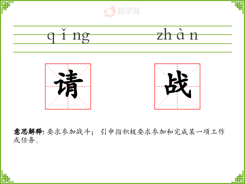 请战的意思是:要求参加战斗; 引申指积极要求参加和完成某一项工作或任务。