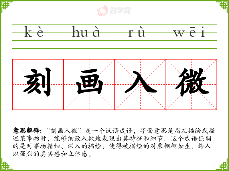 “刻画入微”这个成语在我语言学和表达中具有重要意义,它不仅指导我在写作和创作中追求细节和深度,也让我在日常生活中更加注重细节和质量。通过深入学和分析这个成语,我更加理解了它在不同语境中的应用和价值。