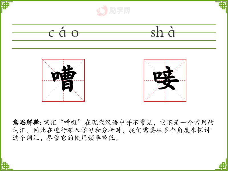 词汇“嘈啜”在现代汉语中并不常见,它不是一个常用的词汇,因此在进行深入学*和分析时,我们需要从多个角度来探讨这个词汇,尽管它的使用频率较低。