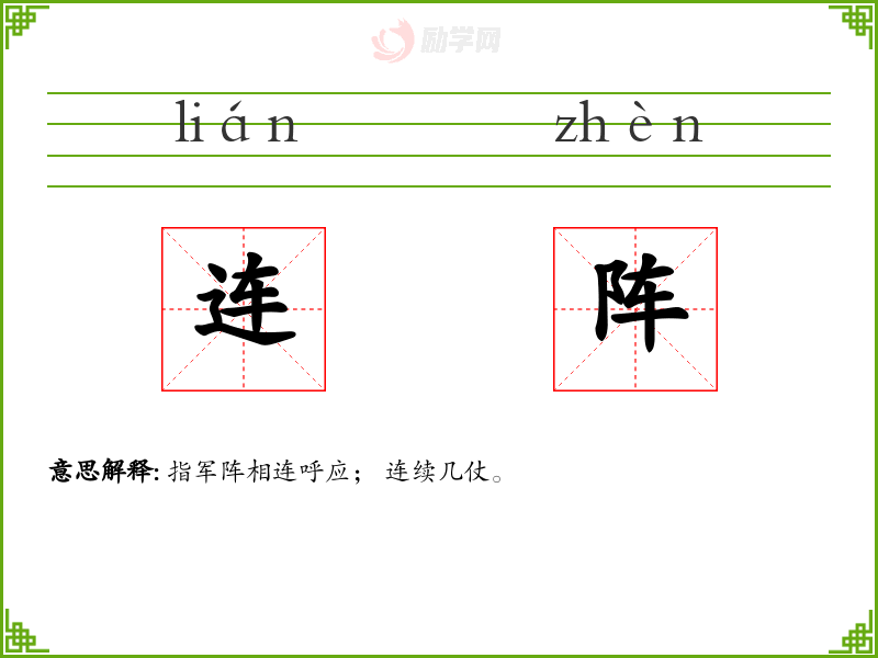 连阵的意思是:指军阵相连呼应; 连续几仗。