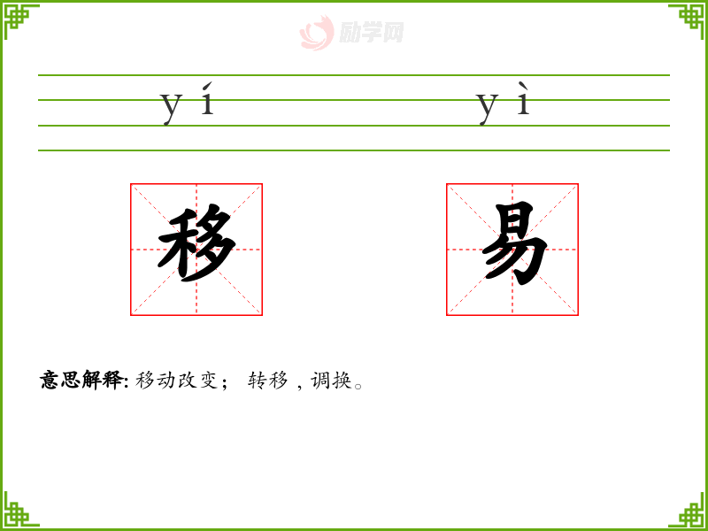 《说文》。徐灏注:“戴氏侗曰:‘移,移秧也。凡种稻必先苗之而移之,迁移之义取焉,别作。灏按:禾苗茂密乃移种之。’”-移,禾相倚移也。