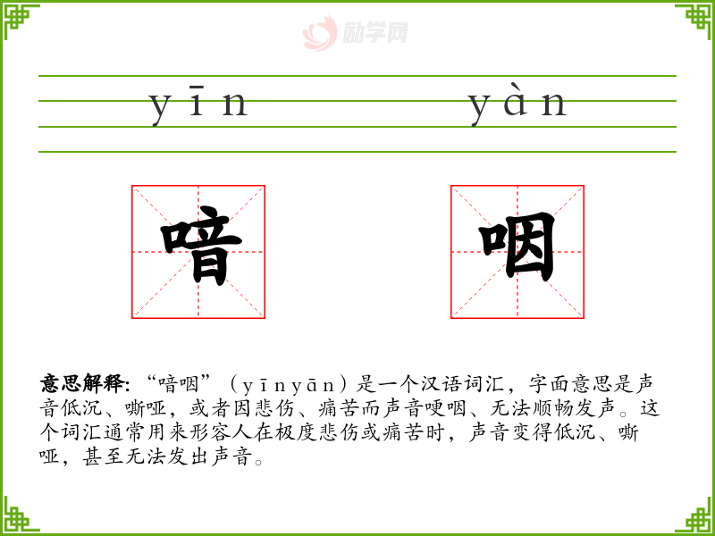 “喑咽”(yīn yān)是一个汉语词汇,字面意思是声音低沉、嘶哑,或者因悲伤、痛苦而声音哽咽、无法顺畅发声。这个词汇通常用来形容人在极度悲伤或痛苦时,声音变得低沉、嘶哑,甚至无法发出声音。