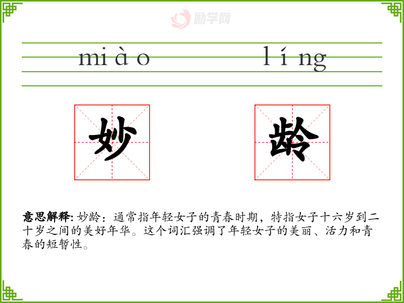 妙龄:通常指年轻女子的青春时期,特指女子十六岁到二十岁之间的美好年华。这个词汇强调了年轻女子的美丽、活力和青春的短暂性。