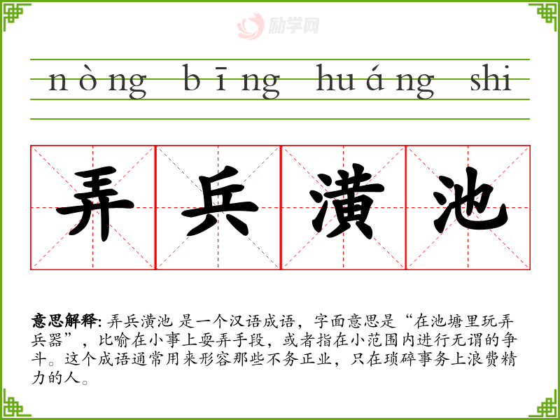 弄兵潢池 出自《左传·僖公二十四年》:“潢池弄兵,非所以为国也。”原意是指在池塘里玩弄兵器,后来逐渐演变为比喻在小事上浪费精力。