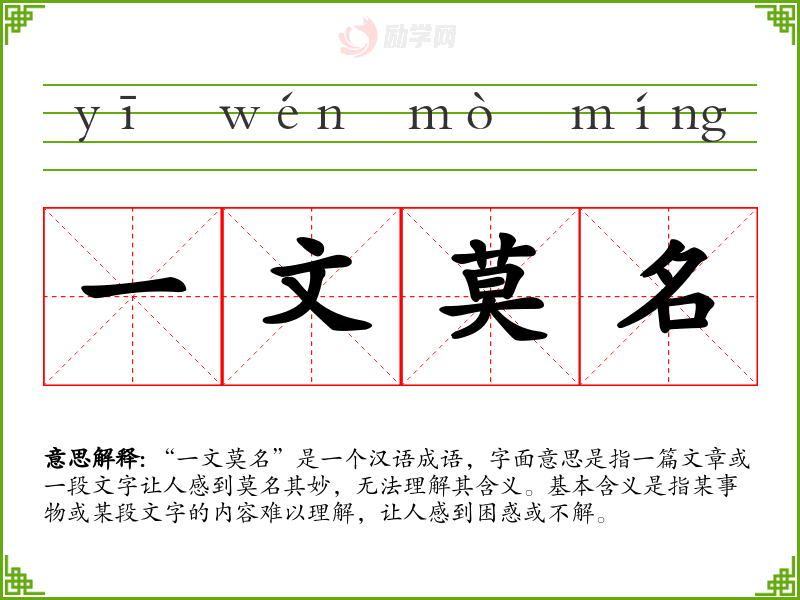 - 文学语境:在文学作品中,作者可能会使用“一文莫名”来形容某些晦涩难懂的诗句或文章,表达读者对其内容的困惑。