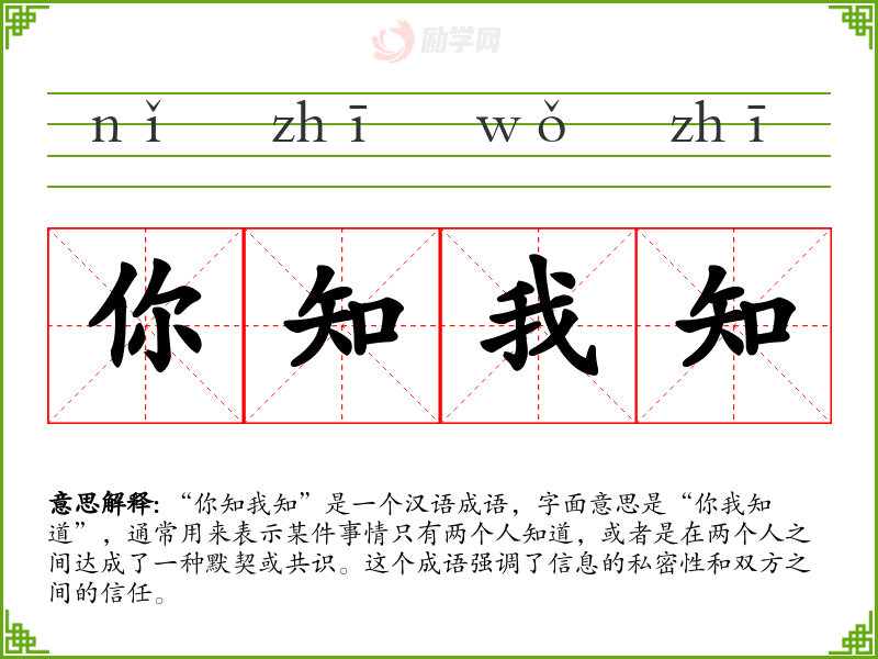 “你知我知”是一个汉语成语,字面意思是“你我知道”,通常用来表示某件事情只有两个人知道,或者是在两个人之间达成了一种默契或共识。这个成语强调了信息的私密性和双方之间的信任。