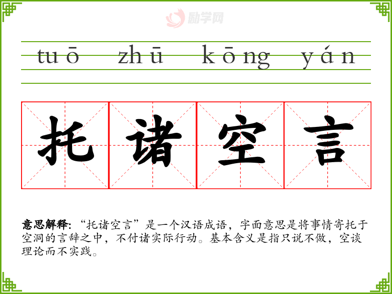 “托诸空言”是一个汉语成语,字面意思是将事情寄托于空洞的言辞之中,不付诸实际行动。基本含义是指只说不做,空谈理论而不实践。