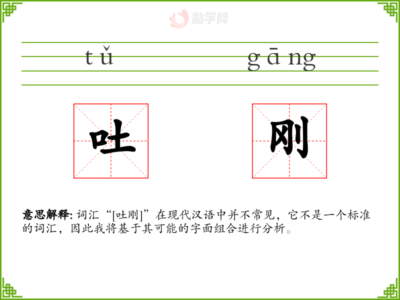 词汇“[吐刚]”在现代汉语中并不常见,它不是一个标准的词汇,因此我将基于其可能的字面组合进行分析。