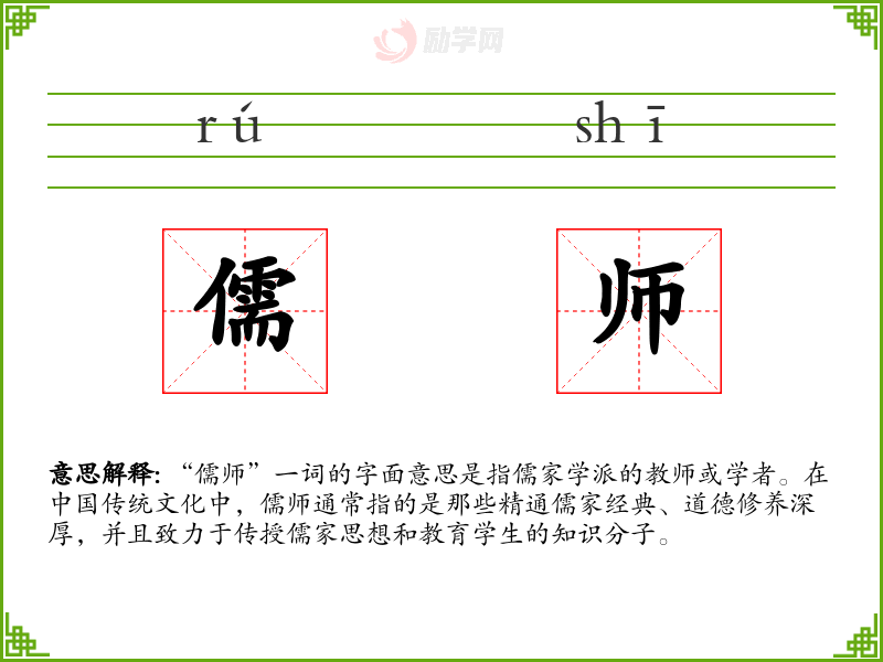 - 反义词:无(由于“儒师”特指儒家学派的教师,其反义词并不明确)