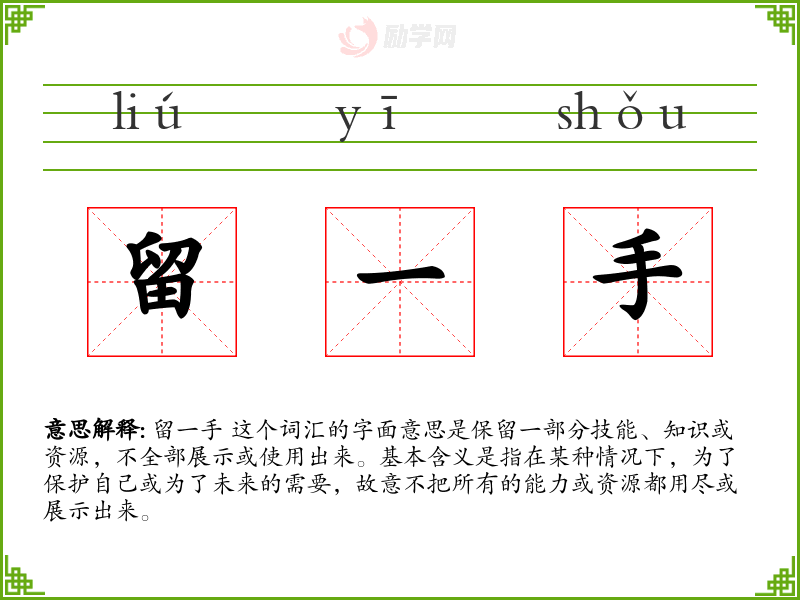 留一手 这个词汇的字面意思是保留一部分技能、知识或资源,不全部展示或使用出来。基本含义是指在某种情况下,为了保护自己或为了未来的需要,故意不把所有的能力或资源都用尽或展示出来。