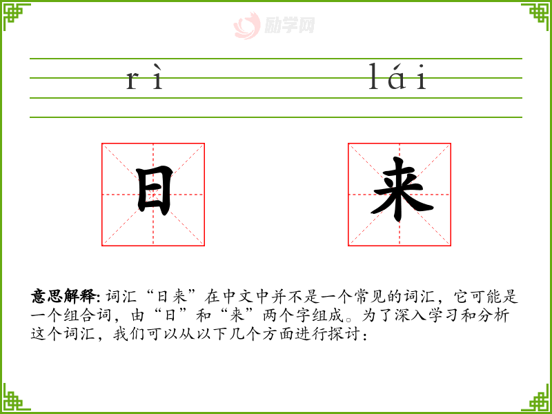 词汇“日来”在中文中并不是一个常见的词汇,它可能是一个组合词,由“日”和“来”两个字组成。为了深入学*和分析这个词汇,我们可以从以下几个方面进行探讨: