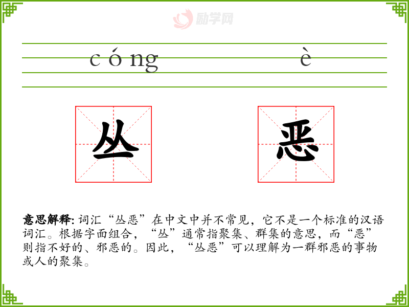 词汇“丛恶”在中文中并不常见,它不是一个标准的汉语词汇。根据字面组合,“丛”通常指聚集、群集的意思,而“恶”则指不好的、邪恶的。因此,“丛恶”可以理解为一群邪恶的事物或人的聚集。