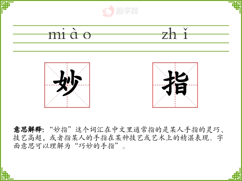 通过对“妙指”这个词汇的深入学*,我更加理解了它在描述技艺和艺术中的重要性。这个词不仅丰富了我的词汇量,也让我在表达对技艺的赞赏时更加精准和生动。