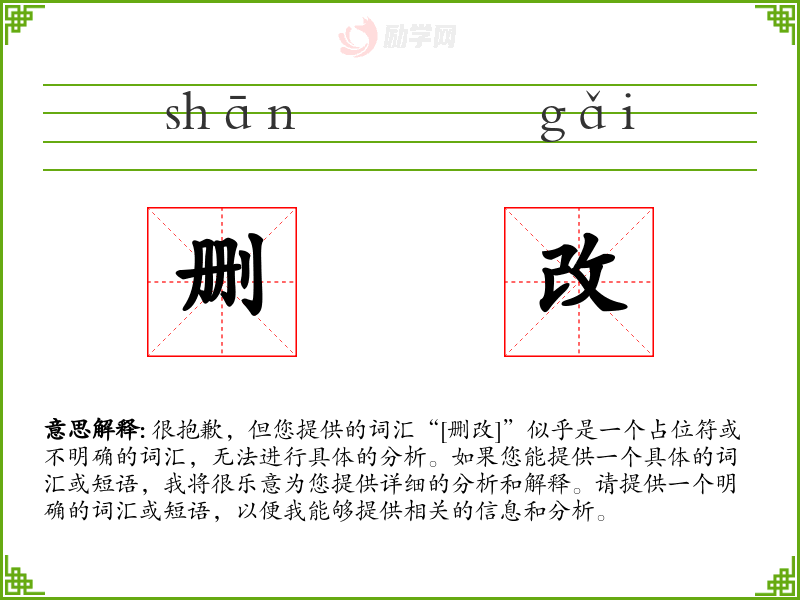 很抱歉,但您提供的词汇“[删改]”似乎是一个占位符或不明确的词汇,无法进行具体的分析。如果您能提供一个具体的词汇或短语,我将很乐意为您提供详细的分析和解释。请提供一个明确的词汇或短语,以便我能够提供相关的信息和分析。