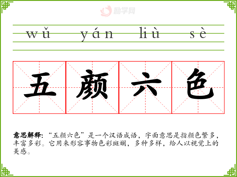 - 同义词:五彩缤纷、色彩斑斓、花花绿绿