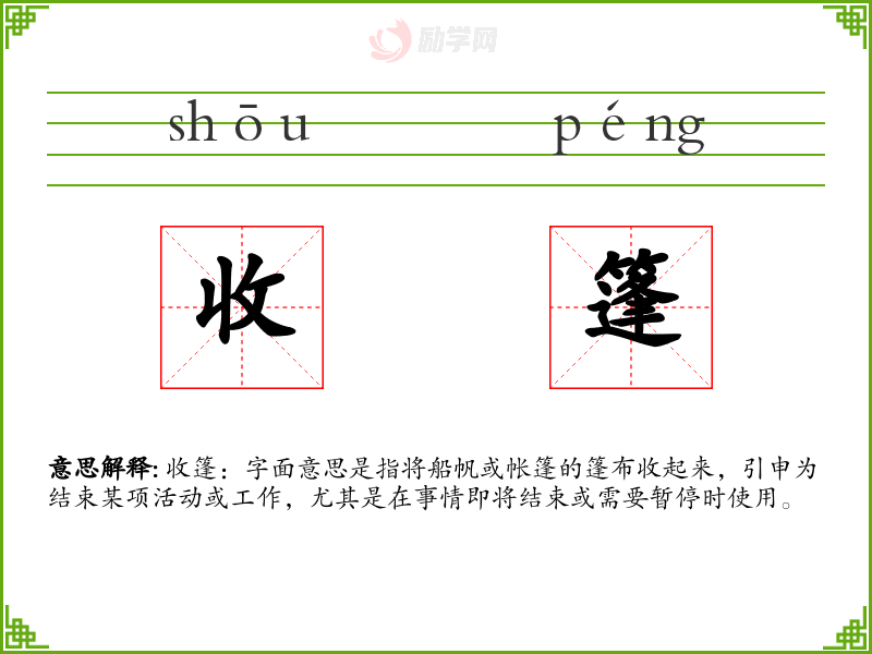 收篷:字面意思是指将船帆或帐篷的篷布收起来,引申为结束某项活动或工作,尤其是在事情即将结束或需要暂停时使用。