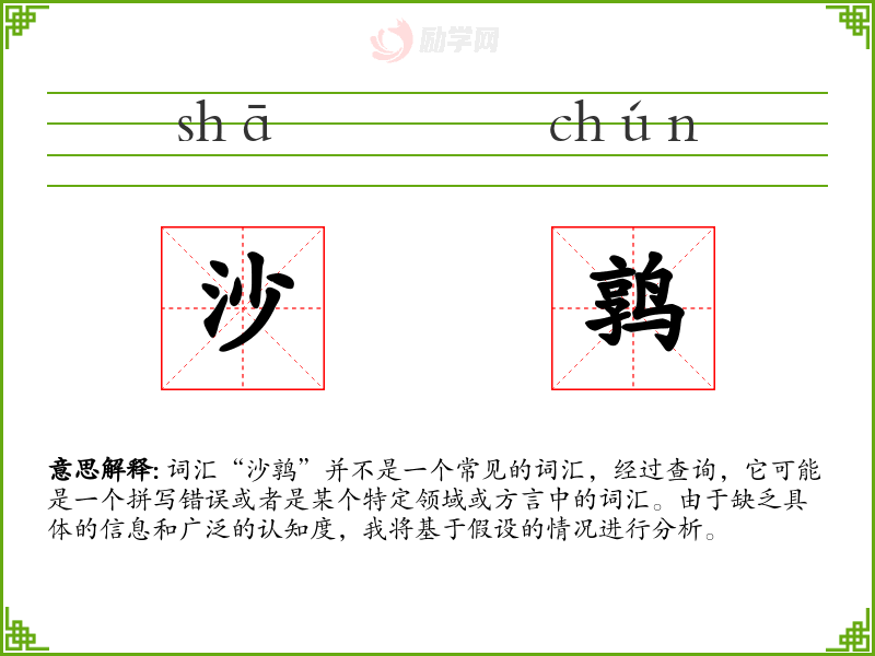 词汇“沙鹑”并不是一个常见的词汇,经过查询,它可能是一个拼写错误或者是某个特定领域或方言中的词汇。由于缺乏具体的信息和广泛的认知度,我将基于假设的情况进行分析。
