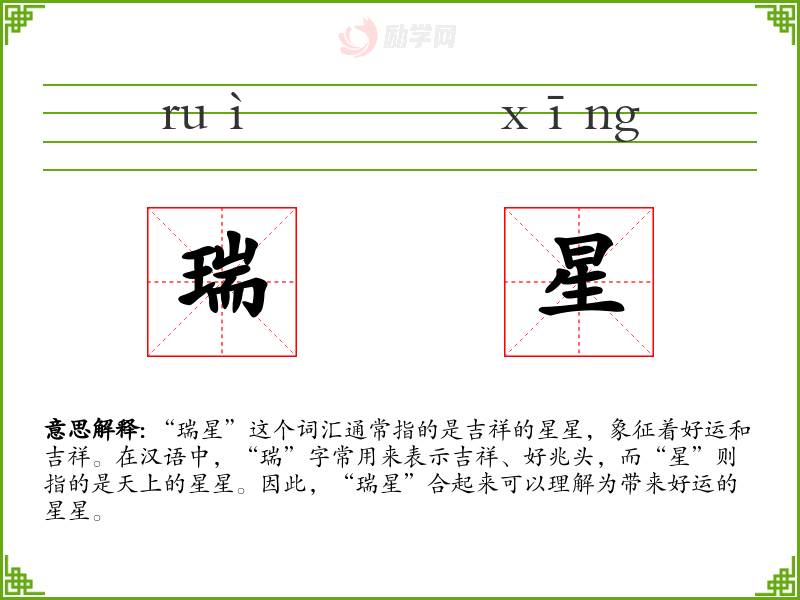 “瑞星”这个词汇通常指的是吉祥的星星,象征着好运和吉祥。在汉语中,“瑞”字常用来表示吉祥、好兆头,而“星”则指的是天上的星星。因此,“瑞星”合起来可以理解为带来好运的星星。