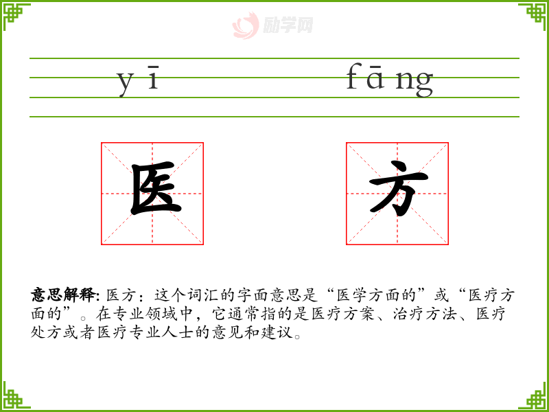 医方:这个词汇的字面意思是“医学方面的”或“医疗方面的”。在专业领域中,它通常指的是医疗方案、治疗方法、医疗处方或者医疗专业人士的意见和建议。