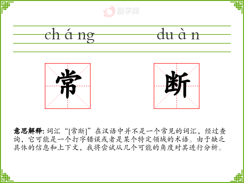 通过对“[常断]”的分析,我们可以看到,词汇的选择和使用在语言表达中非常重要。对于不常见的词汇,我们需要更多的上下文信息来准确理解其含义。在语言学习和表达中,准确使用词汇是沟通的关键。
