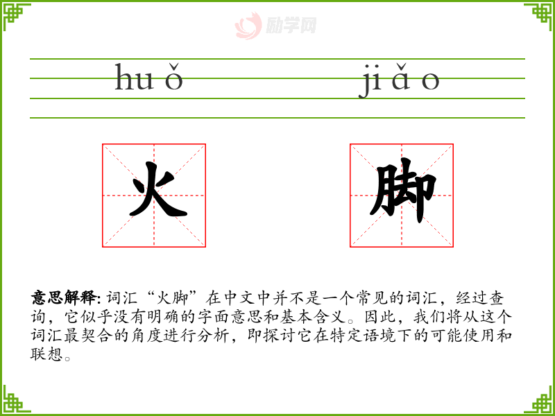 由于“火脚”不是一个标准词汇,我们无法提供一个确切的基本定义。它可能是某个方言中的词汇,或者是网络用语中的一个创造性表达。