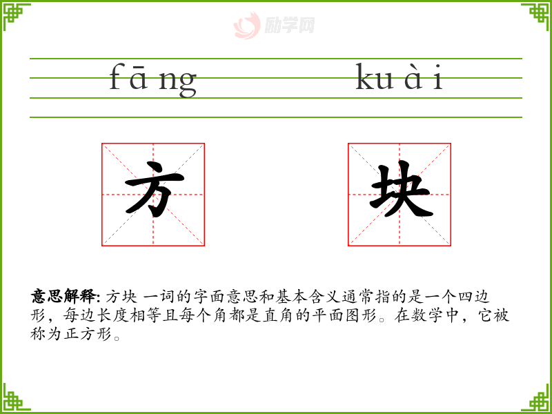 方块 一词的字面意思和基本含义通常指的是一个四边形,每边长度相等且每个角都是直角的平面图形。在数学中,它被称为正方形。