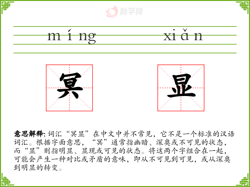 - 反义词:无(由于“冥显”不是一个常用词汇,反义词不明确)