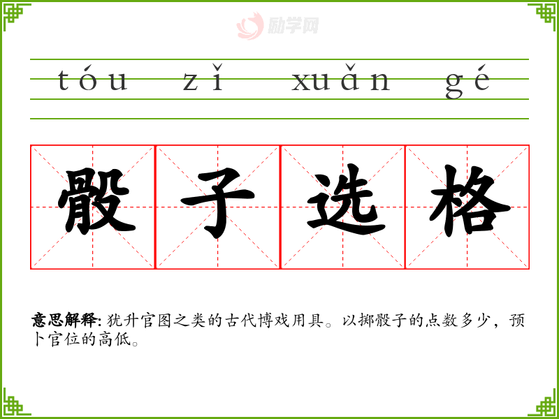 骰子选格的意思是:犹升官图之类的古代博戏用具。以掷骰子的点数多少,预卜官位的高低。