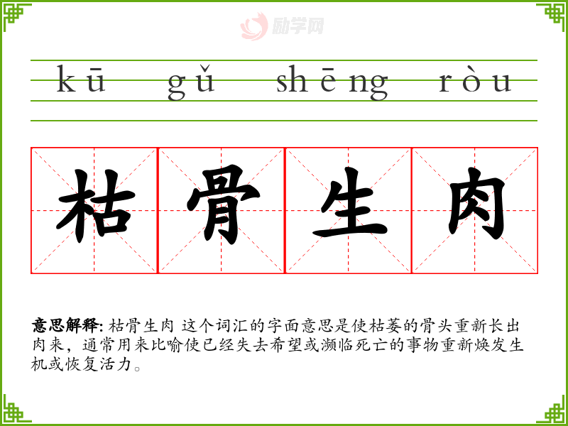 枯骨生肉 这个词汇的字面意思是使枯萎的骨头重新长出肉来,通常用来比喻使已经失去希望或濒临死亡的事物重新焕发生机或恢复活力。